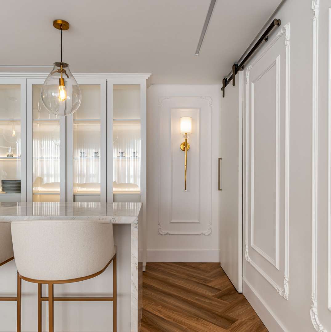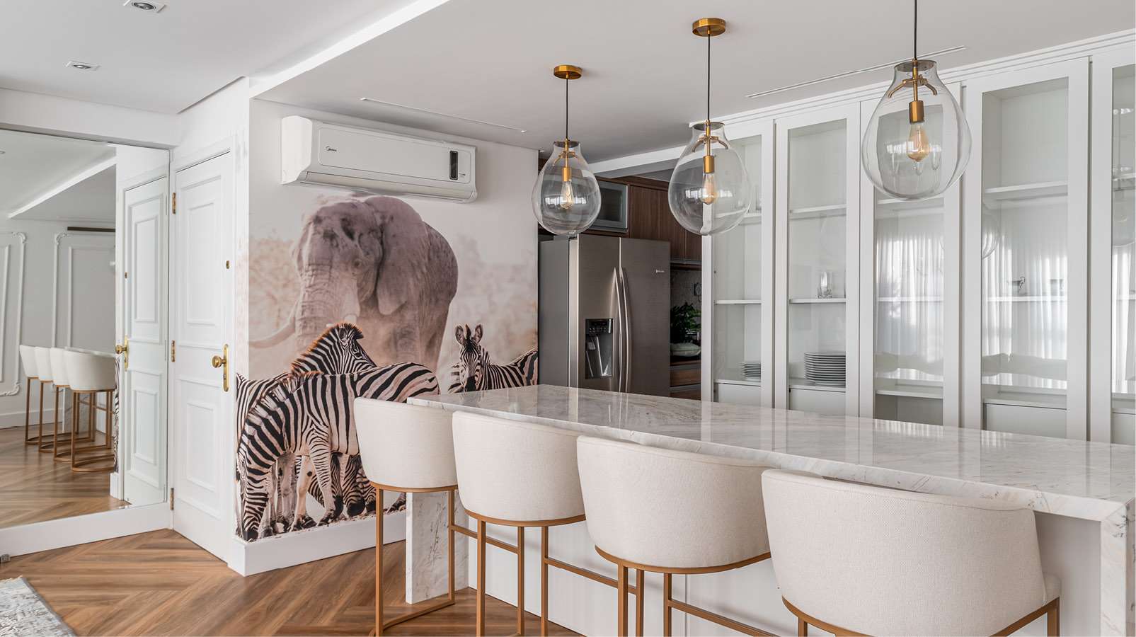 Inspirado no estilo clássico, boiseries super rebuscadas e banquetas douradas se mesclam com mobiliário desenhado pelas arquitetas, trazendo referências do clássico americano. A bancada de alvenaria, que fazia a separação entre cozinha e sala de jantar, foi retirada, facilitando a circulação, além de dar espaço a uma ilha em marcenaria.