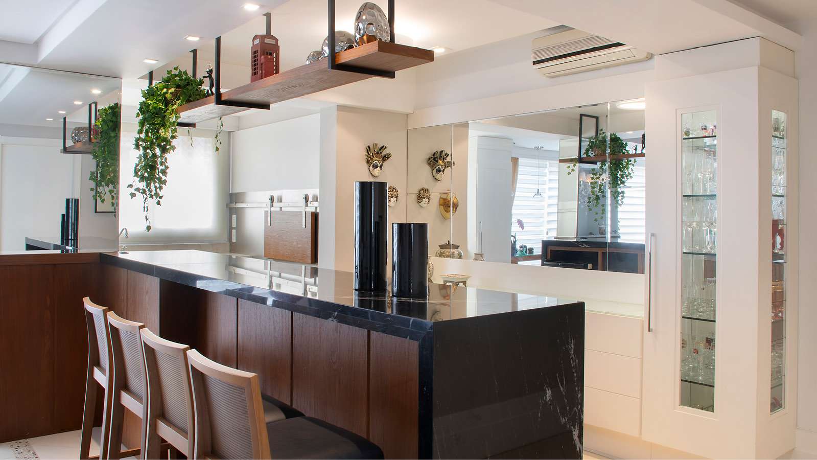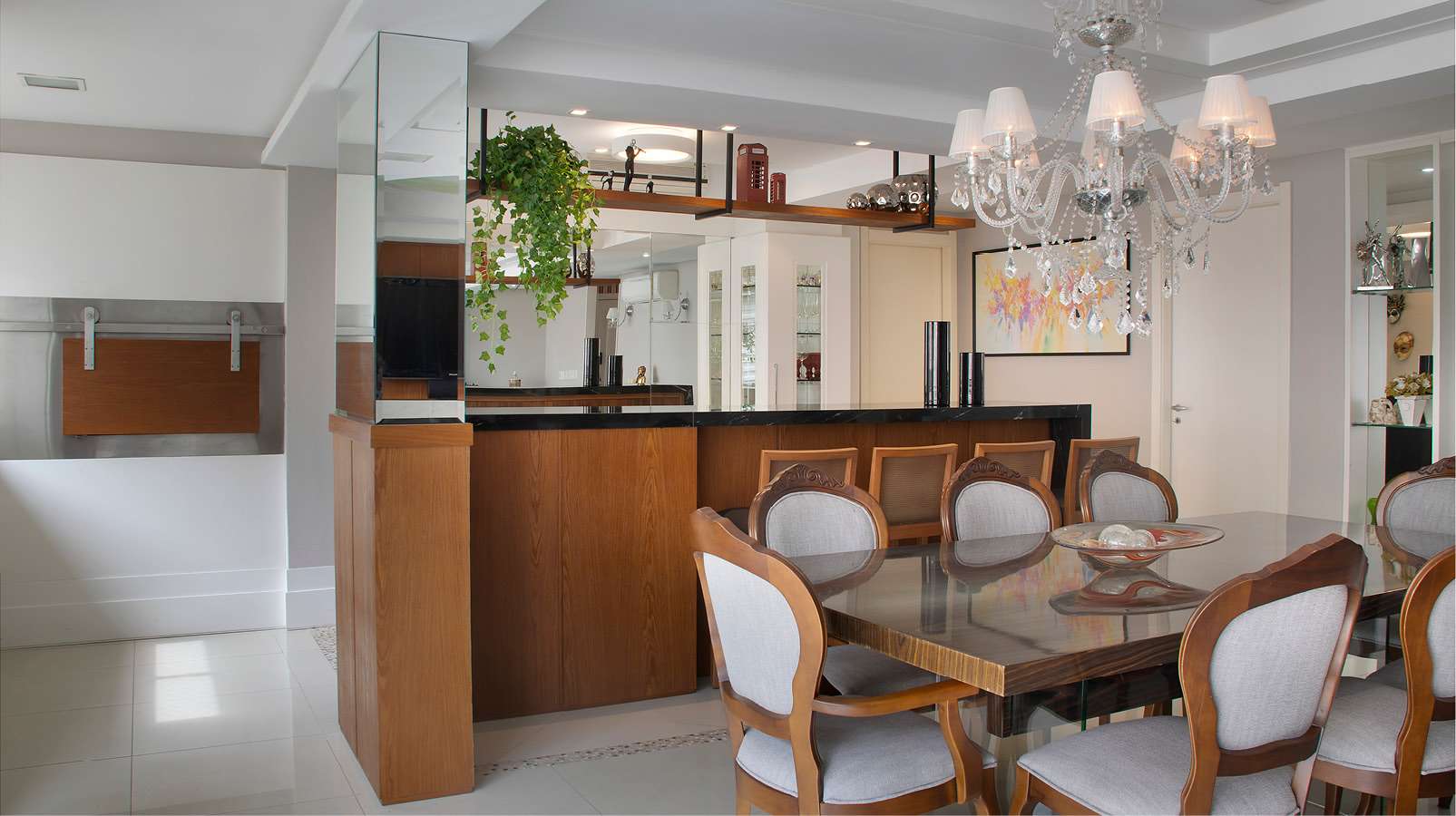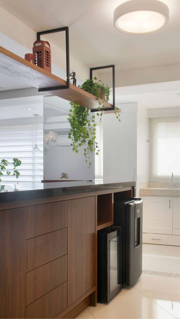 O balcão foi feito no padrão Carvalho Nassau, na marcenaria, e com tampo em granito Via Láctea da Eládio Pedras. Toda a marcenaria é projeto da arquiteta, desenvolvida sob medida para que se aproveitasse ainda melhor os espaços. Enquanto isso, os móveis soltos foram minuciosamente escolhidos no catálogo da Elevato Casa Poa, harmonizando com os ambiente integrados. Espelhos ao fundo do living e no pilar, foram aplicados para dar amplitude. Foram utilizados materiais claros no piso, como o porcelanato em grande formato da Stilo Elevato.Coroando todos os detalhes do living, uma iluminação foi projetada para oferecer diferentes efeitos cênicos, com opções de luzes indiretas e pontuais, localizadas no forro de gesso e nos móveis, tudo automatizado.