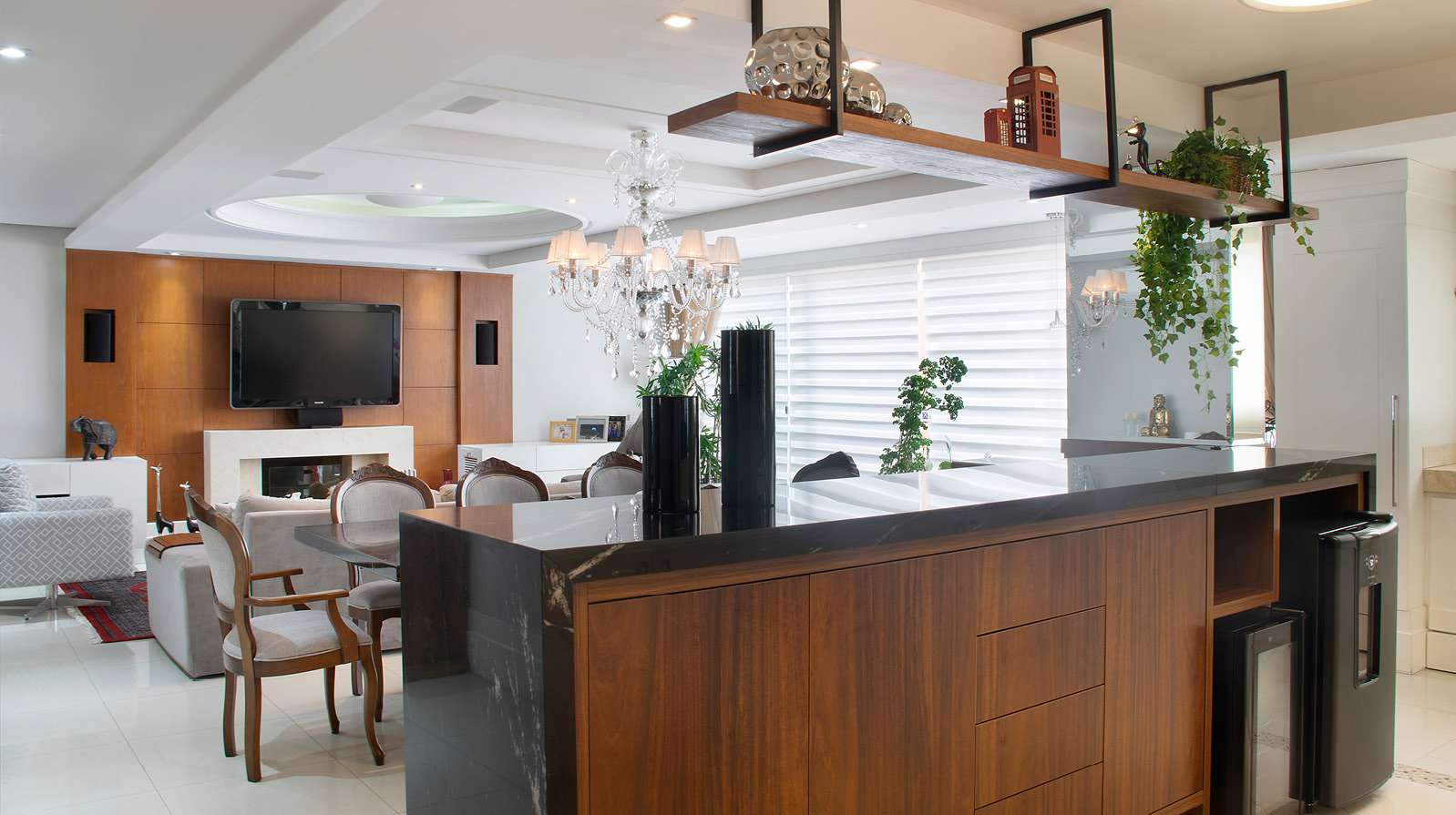 Foram anexados ao espaço, além da varanda, um dos quatro dormitórios, ficando o living com estar, jantar, churrasqueira com bar integrados, mais hall e lavabo, totalizando 56m2. O foco da personalização dos ambientes foi voltado para o conforto, a qualidade e a fácil manutenção, valorizando os espaços para atender as aspirações do casal de proprietários, que gosta muito de receber amigos e familiares e solicitaram espaço para atender a churrasqueira com um balcão que comporta cervejeira, adega, espaço para louças, talheres e assessórios de churrasco, além do móvel em laca branca que possui local para os cristais.