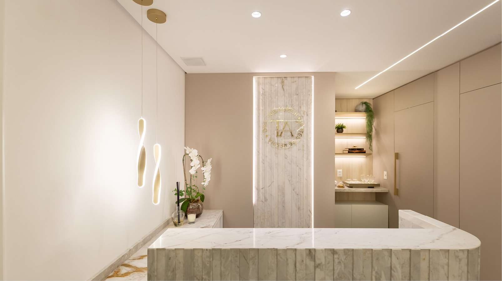 A otimização espacial orientou todo o layout. O tratamento acústico entre as salas foi integrado à estética através de painéis que proporcionam unidade visual ao conjunto, destacando o expressivo balcão curvo em mármore na recepção. O painel decorativo, com suas formas orgânicas que remetem a um grande sol, estende-se da recepção ao interior do consultório, criando uma narrativa visual que proporciona fluidez entre os ambientes.