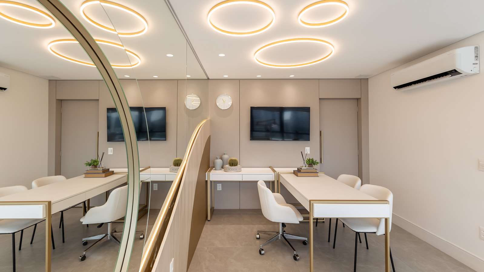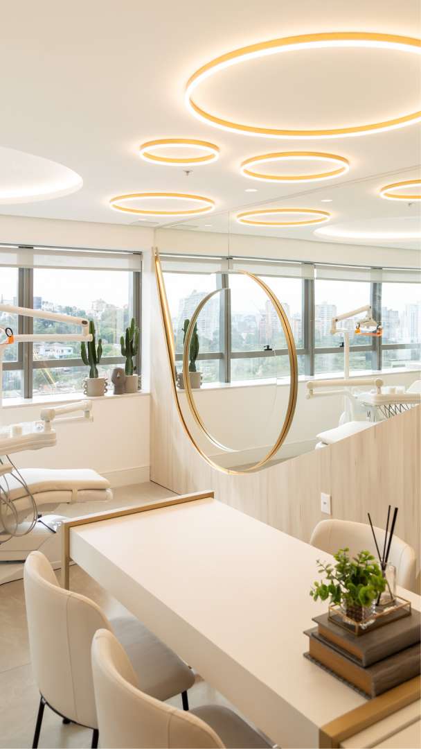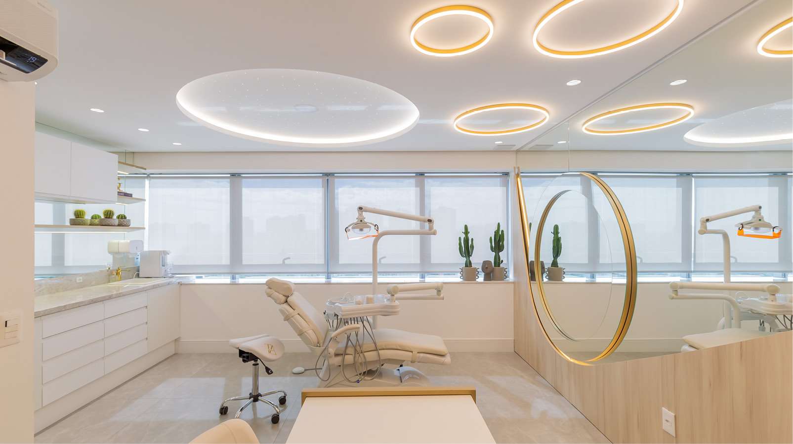 O projeto luminotécnico, elemento fundamental da composição, combina iluminação direta e indireta para criar diferentes atmosferas. Sobre a cadeira odontológica, um céu estrelado em fibra ótica proporciona momentos de relaxamento durante os procedimentos. Ao final do atendimento, o paciente é conduzido a um grande espelho circular, sobreposto ao revestimento espelhado da parede, onde halos de luz estrategicamente posicionados permitem a contemplação do resultado do trabalho realizado. Este projeto personifica a harmonia entre modernidade, sofisticação e criatividade, onde cada elemento foi meticulosamente planejado para atender às necessidades profissionais e proporcionar uma experiência memorável aos pacientes.