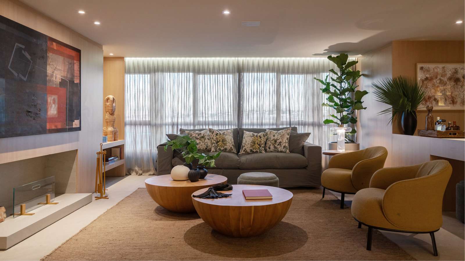 O aconchego e a descontração surgem por meio das texturas dos tecidos da ML Tecidos, do tapete em fibra do Expresso Oriente e dos estofados da Gobbi. As cortinas em tecido leve da Manjabosco filtram a luz de maneira sutil, trazendo conforto visual ao espaço.