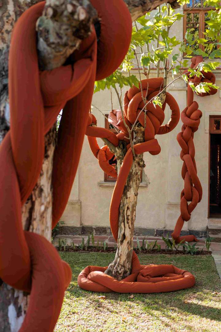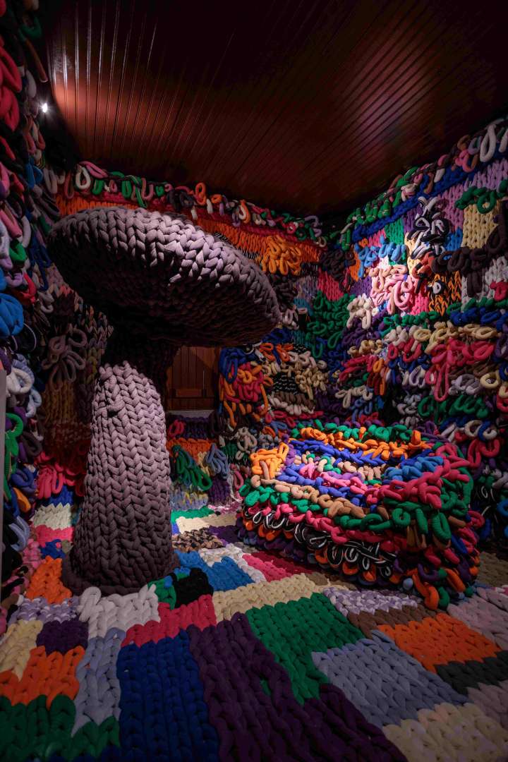 A casa ancestral, que data de 1934, se mostra como o cenário perfeito para abrigar a Exposição. Desde os jardins, passando pela porta de entrada e percorrendo as escadarias dos três andares, por aqui e por ali, pelos vãos, em cada cantinho, o tricô percorre troncos de árvores e imita cogumelos em grande escala, como uma espécie de ‘invasão’ de território, ao mesmo tempo em que cria um espaço de contemplação, acolhimento e regeneração. O tricô tece os corrimões, sustenta vigas, espalha-se pelas paredes e pelos tetos, em uma grande instalação aconchegante, quentinha, natural.