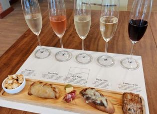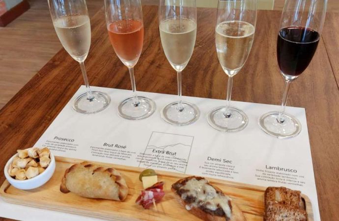 Degustação de quatro espumantes e um frisante, harmonizados com cinco mini porções.