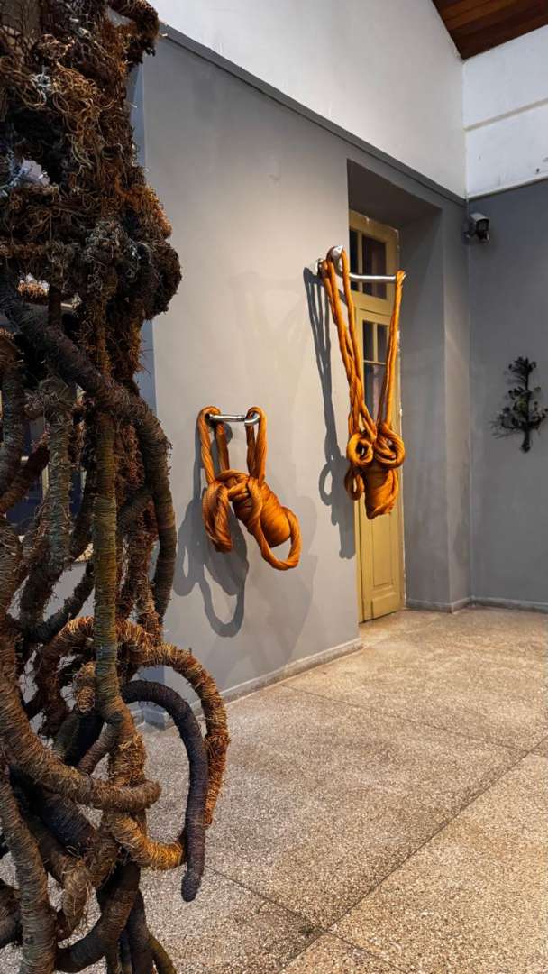 Já Nara Guichon transforma redes de pesca descartadas, responsável por cerca de 50% da poluição mundial dos oceanos, em matéria-prima. Ao recolher redes de pesca abandonadas, ela inicia um rito de purificação: lava, tinge com pigmentos naturais, costura, tricota, enrola. Em cada gesto, um reencontro com a natureza, um retorno à sabedoria da matéria. Suas estruturas têxteis são verdadeiros ninhos, onde memória e ecologia entrelaçam-se.