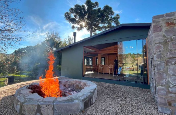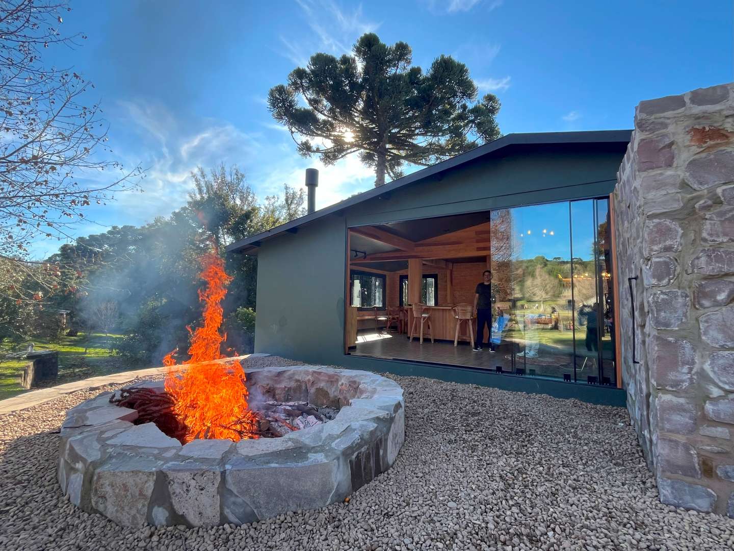 Mais do que um ponto de venda, a Casa do Fogo foi criada para proporcionar momentos de aconchego, aromas envolventes e contemplação da paisagem. O ambiente envidraçado conecta o interior da casa à área externa, onde o fogo arde como elemento central, criando um clima acolhedor para degustar vinhos, saborear pizzas artesanais e apreciar a natureza ao redor.