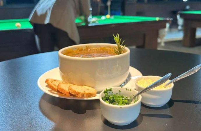 Para tornar a experiência ainda mais especial, o pub oferece ainda vinhos da Vinícola Armando Peterlongo Menegotto, além de rótulos internacionais. "A gente gosta de criar ambientes que acolham as pessoas. Seja numa partida de sinuca, num pastel compartilhado ou num brinde a dois, tudo aqui é pensado para celebrar bons momentos", destaca Valdemir Linhares da Silva, proprietário do pub. O valor do caldo de 500g custará R$ 29,00.