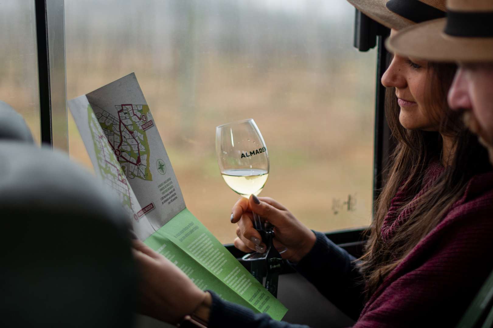 Trem do Pampa – Passeio operado pela Giordani Turismo com degustação de vinhos Almadén no vagão e parada na Vinícola Almadén para visita e degustação.