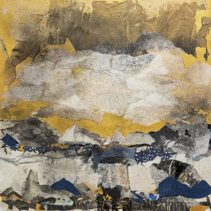 As obras apresentam camadas de papéis rasgados, tecidos e fragmentos de trabalhos anteriores, reorganizados para criar composições que evocam memórias e paisagens internas. O dourado, usado como lampejo ou detalhe, remete ao kintsugi japonês, valorizando as fraturas como parte da história.