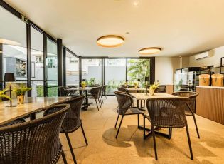 Na área externa, o visitante encontra um lounge coberto por uma estrutura sinuosa e escultural, inspirada nas criações do arquiteto paulista Artacho Jurado. Com curvas e aberturas que criam movimento. A cobertura metálica garante amplitude, leveza e integração visual entre os espaços, conduzindo naturalmente ao café. Situado em ambiente interno, o café mantém conexão com o verde do jardim, criando um clima acolhedor.