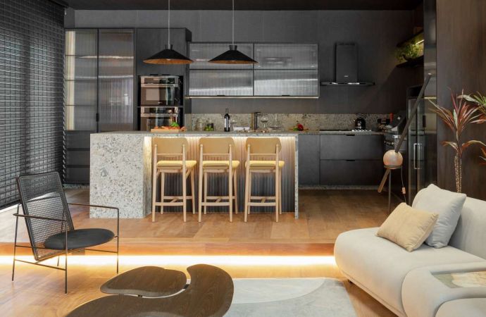 Minimalista, industrial e ao mesmo tempo acolhedor, o espaço combina materiais naturais como madeira, pedra e ferro com acabamentos tecnológicos e iluminação em LED. A cozinha gourmet integrada transforma o ambiente em um verdadeiro palco de celebração, com cooktop, torre quente, coifa circular e adega embutida. O projeto também conta com infraestrutura para carregador elétrico, reforçando o compromisso com a sustentabilidade.