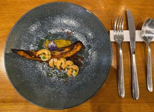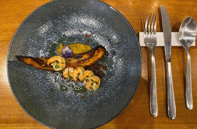 A entrada “Pelo Litoral” combina moranga cabotiá defumada, camarão flambado na cachaça marisqueira, crocante de linguiça de cordeiro salineiro e azeite verde cítrico. O prato principal, “Pelos Campos”, traz costela 12 horas ao molho demi glace de butiá, acompanhada de purê de cogumelo Porcini e alho negro, além de vegetais orgânicos tostados na manteiga artesanal. Encerrando a experiência, a sobremesa “Pelas Serras” oferece um bolo de aipim e textura de bergamota— gelato, coulis e pó cítrico — em uma releitura delicada e surpreendente do clássico regional.