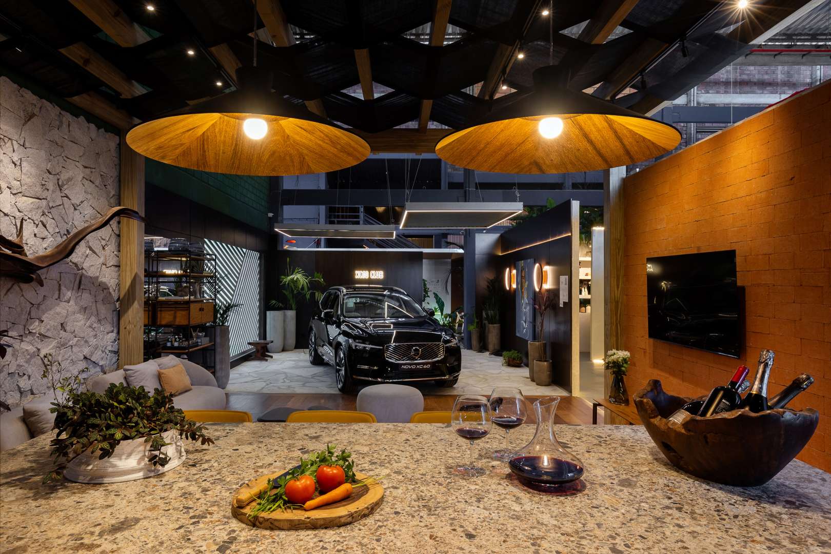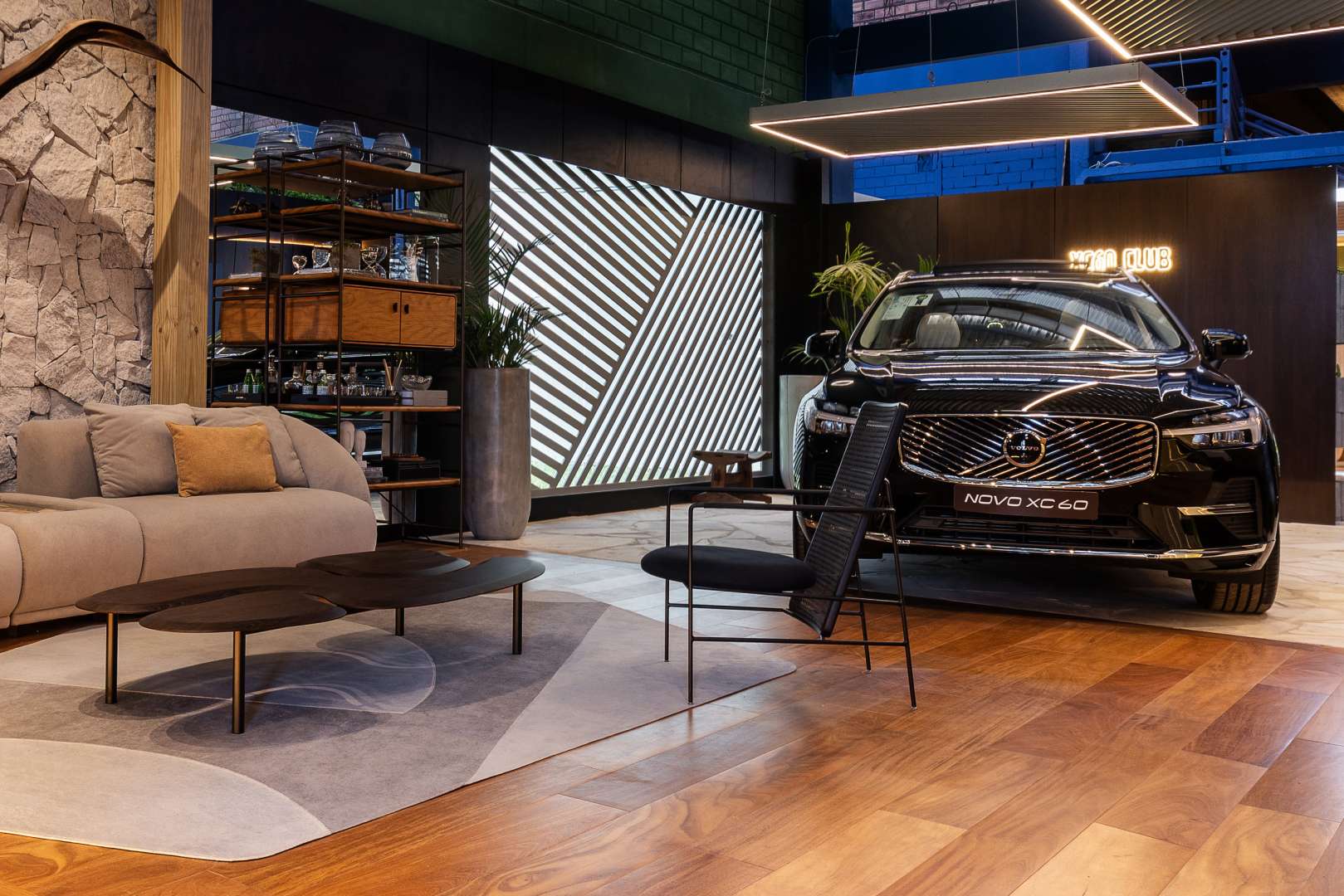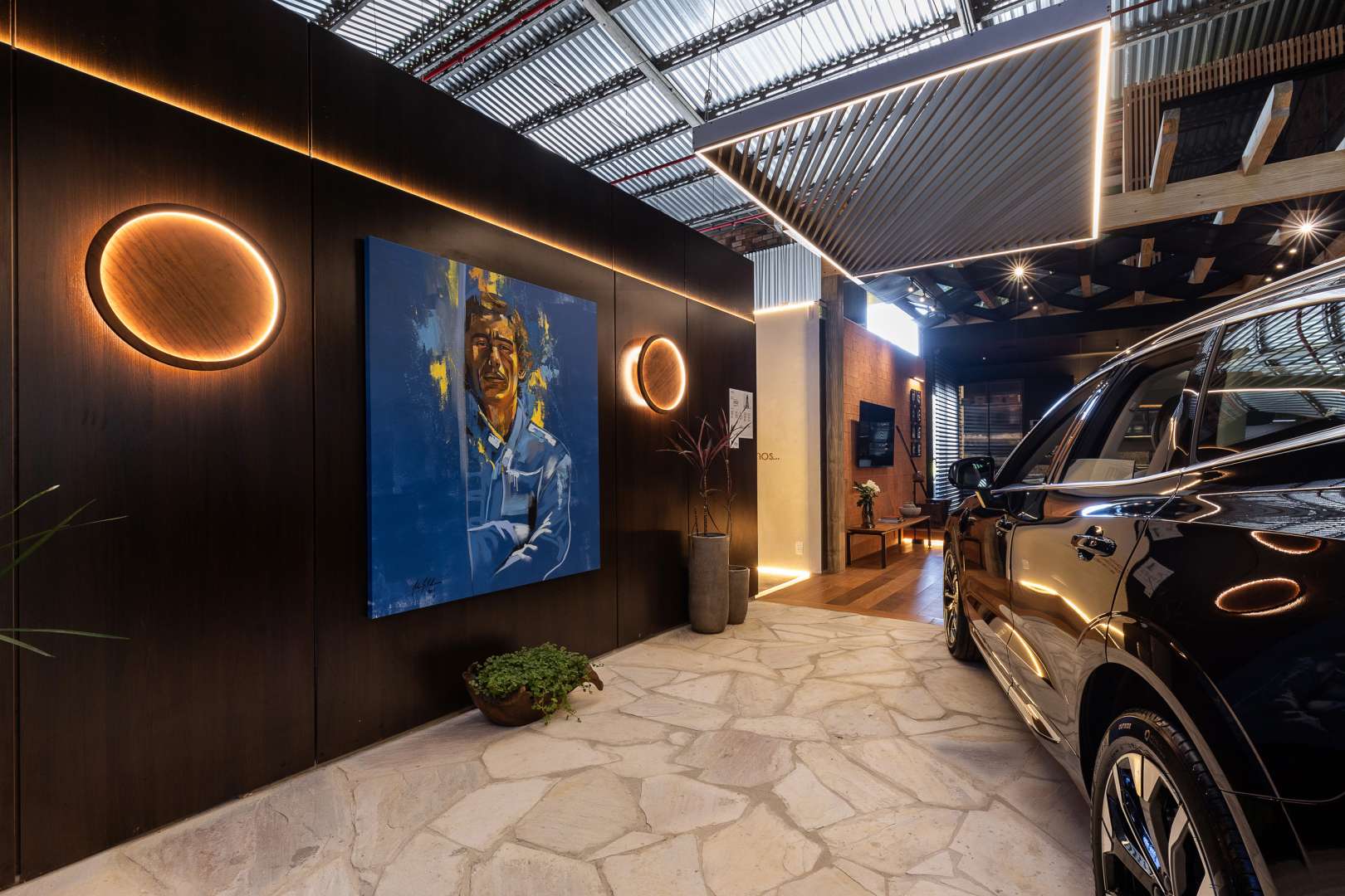 Com 86m², o espaço foi desenhado para atender a um perfil masculino contemporâneo — que valoriza o design, o convívio e a praticidade — sem abrir mão da sofisticação. A volumetria arquitetônica surpreende com a sobreposição de um pergolado de madeira ao módulo térreo, sugerindo um segundo nível e elevando o espaço a uma espécie de "loft automotivo".