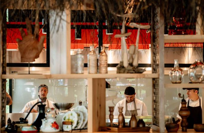 Um dos pontos altos do evento foi o Memorial Soleil, uma instalação criada por Evandro Catuci a partir de madeiras recolhidas do Rio Caí após as enchentes de 2024. A obra, intitulada Un toco di sol, simboliza a reconstrução e o renascimento — um tributo à força e à esperança que movem a Serra Gaúcha. O ambiente ainda abriga esculturas em madeira orgânica do artista Marino Fritsch, presente na ocasião, e louças em cerâmica artesanal assinadas por Marina Balestreri, da Flô Arte em Cerâmica, esposa do chef Filipe Andrade.