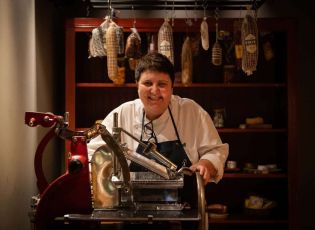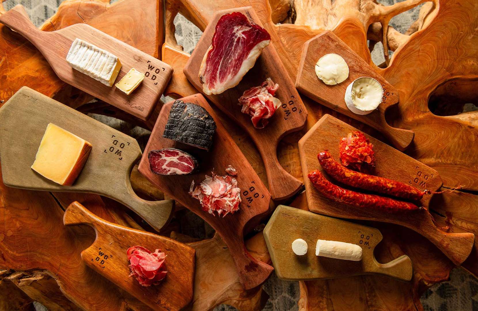 Todas as charcutarias chegam à mesa finamente laminadas na hora, como exige a boa tradição. É quase como assistir a um baile no salão: a fatiadora manual, de cor vermelha, batizada de Anita — em homenagem à gaúcha Anita Garibaldi —, gira com elegância enquanto entrega lâminas delicadas de sabor. As fatias repousam sobre tábuas exclusivas feitas à mão pelo artista canelense Daniel Castelli, que completa a experiência com um toque de arte e território.