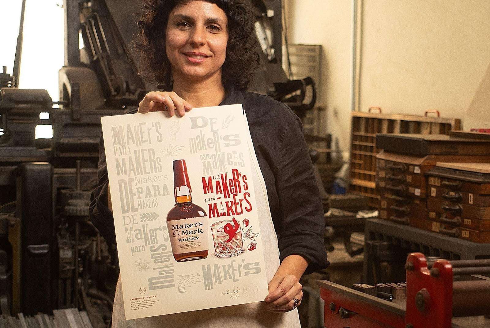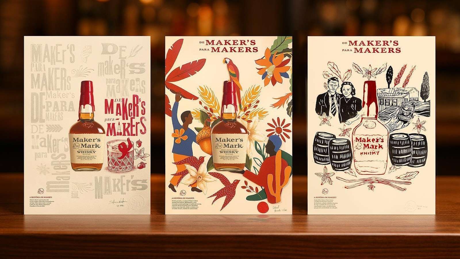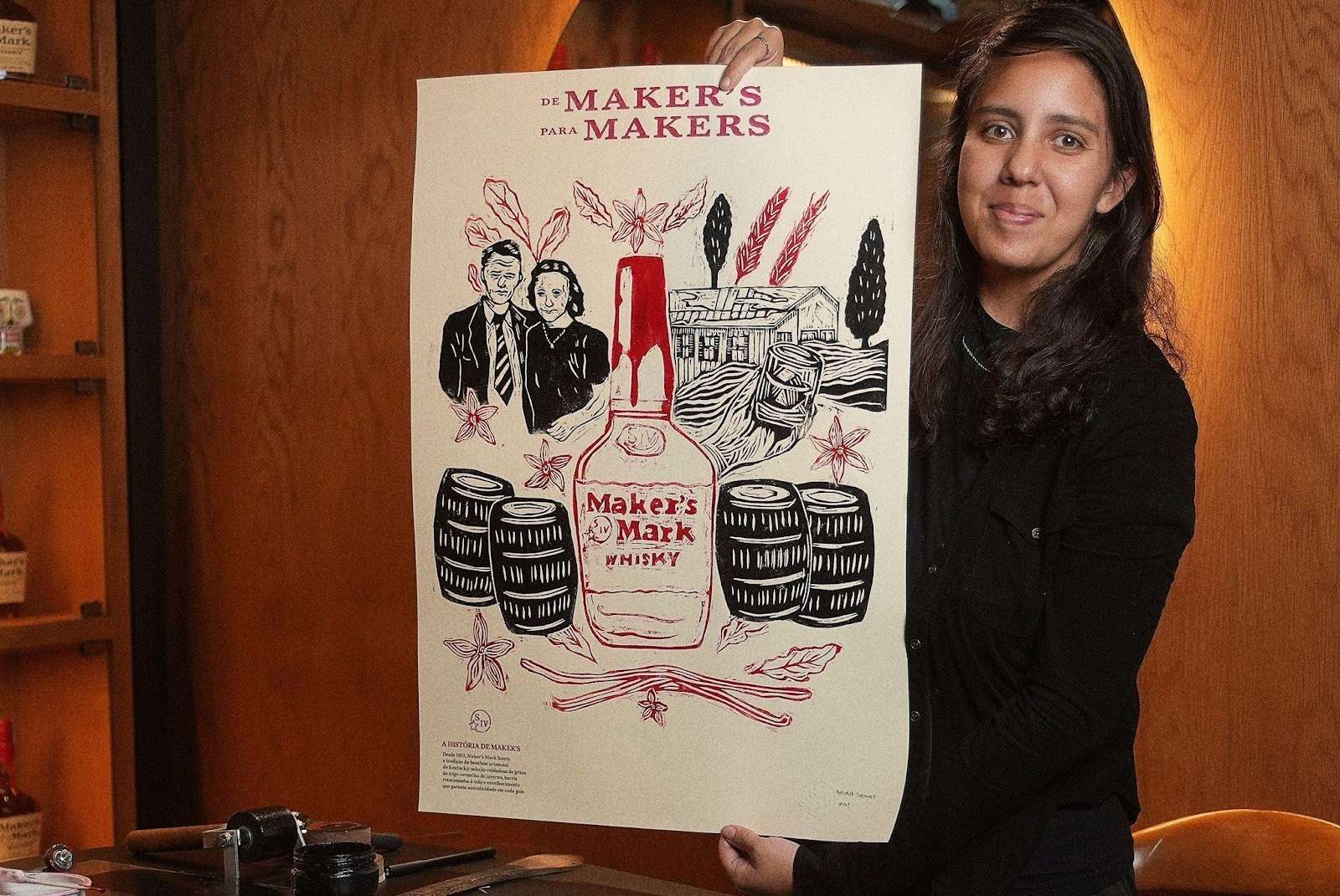 A proposta celebra o processo artesanal que define a identidade de Maker’s Mark desde sua origem no Kentucky, em 1953. Assim como cada garrafa é finalizada manualmente com o icônico lacre de cera vermelha, cada pôster da campanha foi produzido em técnicas manuais, traduzindo autenticidade e expressão individual de cada um dos artistas. A exposição durante o coquetel reforça esse diálogo com a arte, celebrando o olhar criativo que une Maker’s Mark, artistas e coquetelaria.