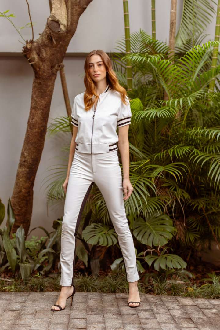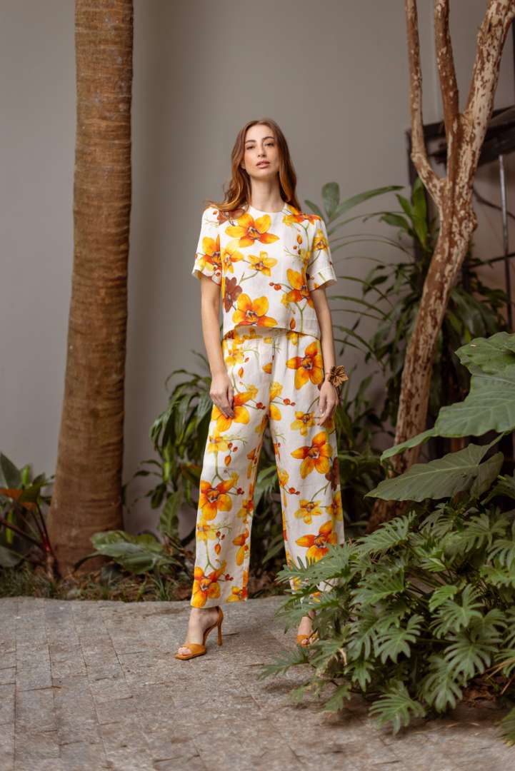 Nesta coleção, além de peças exclusivas pintadas à mão, uma a uma, por Mariana, o couro perfurado, clássico da St. Trois, surge com novas leituras. Em peças inteiras ou pontos estratégicos, dá leveza ao look, ao lado de babados aplicados em blusas, e saias em evasê, conferindo movimento e feminilidade. A alfaiataria em couro, cuidadosamente construída pela marca, permite ainda combinações com peças básicas do guarda-roupa contemporâneo, sem perder o requinte. Também entram em cena tecidos leves, como linho e seda, este com uma estampa exclusiva que celebra a orquídea, flor símbolo da Colômbia, como um tributo à natureza e à cultura local.