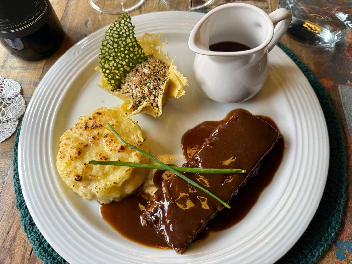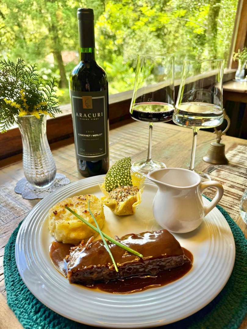 Prato principal: Costela serrana ao molho Babette (à base de carnes e especiarias) Acompanha batatas sapecadas e farofa de pinhão. Harmonização: Aracuri Cabernet Merlot