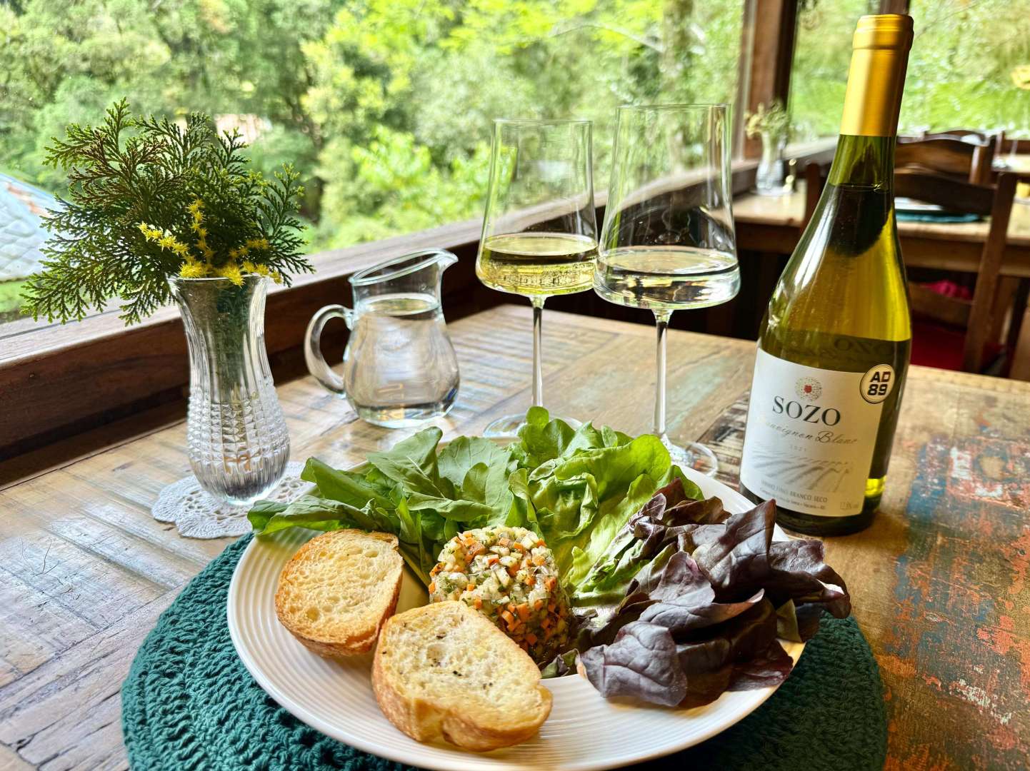 Entrada: Salada de verdes com vinagrete de maçã e torradinhas. Harmonização: Sozo Sauvignon Blanc
