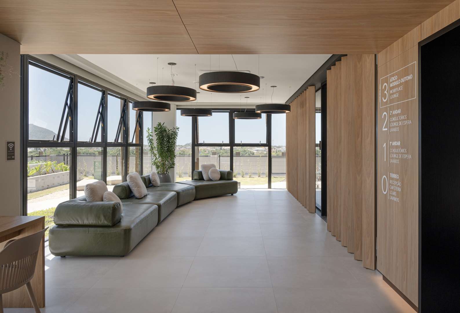 A infraestrutura inclui ainda auditório, salas multiuso, lounges, recepção com cafeteria e espaços ao ar livre, como o terraço de 800 metros quadrados que serve como área de bem-estar e até mesmo para atendimentos em meio à natureza. Há também soluções sustentáveis, como reaproveitamento de água da chuva e telhado verde, que reforçam o compromisso do Ekos com práticas ecológicas e responsáveis.