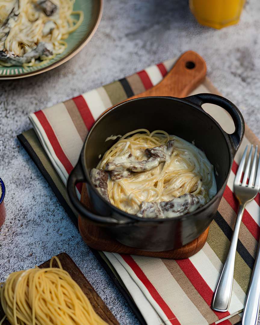 Fusilli Longo Quatro Queijos com Iscas de Filé Mignon: uma combinação que une a aveludada cremosidade do blend à suculência das iscas de filé.