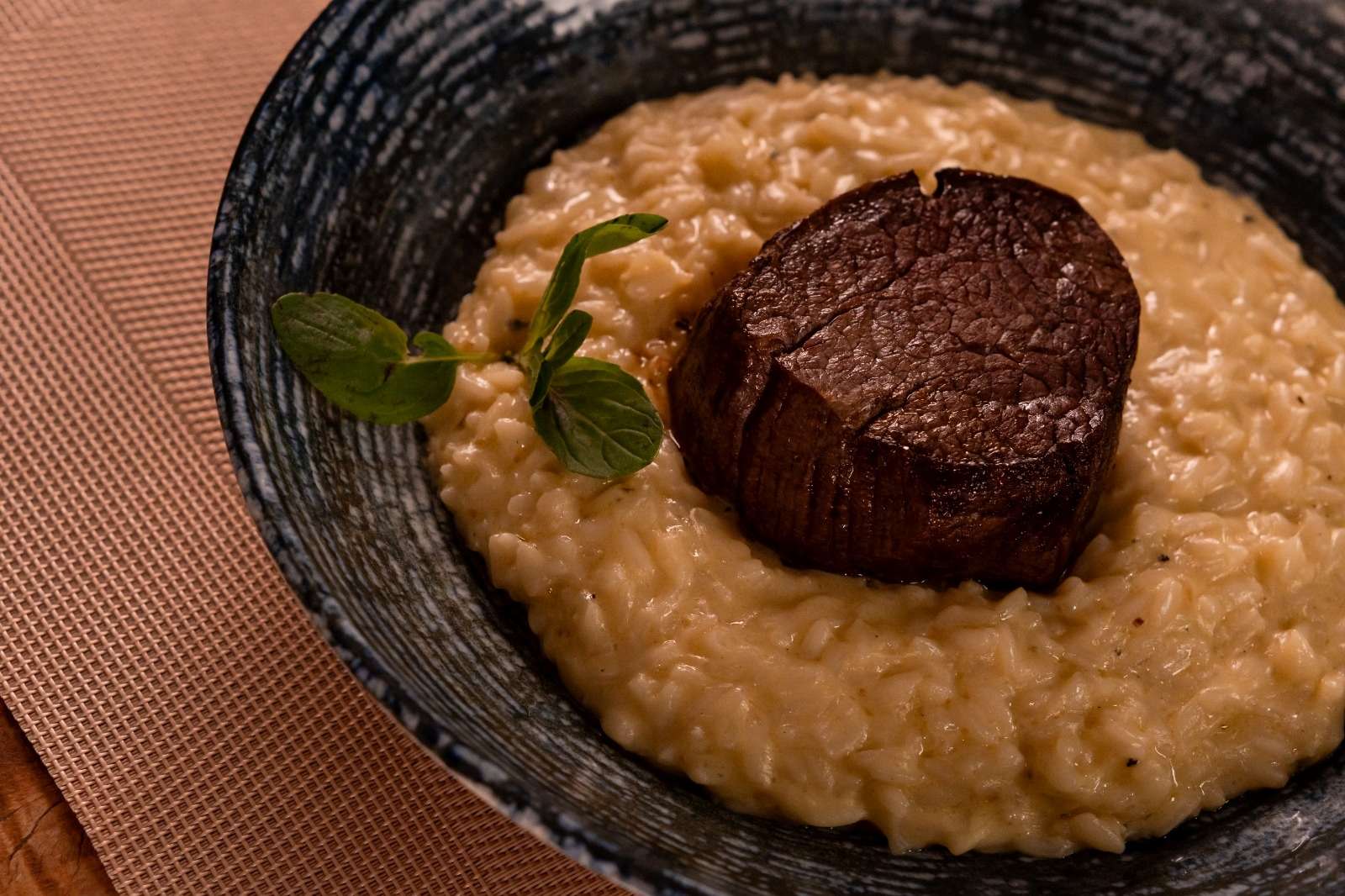Risotto 4 Queijos com Medalhão de Mignon: Arroz carnaroli com molho quatro queijos, acompanhado de um suculento medalhão de filé mignon.