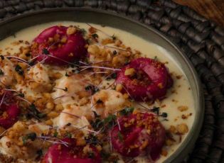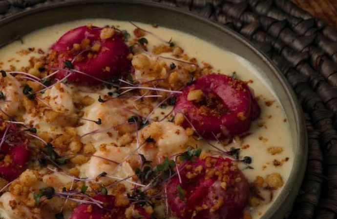 Sorrentino de Brie e Camarão: Massa recheada com queijo brie, acompanhada de camarões grelhados e um blend de molho quatro queijos e calda de hibisco.