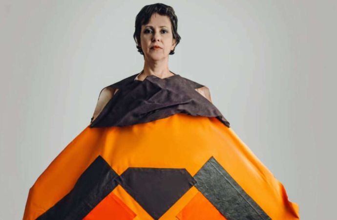 De acordo com a artista, os trajes que apresenta expandem essa compreensão. “Concebi as peças como armaduras de proteção para o corpo contemporâneo: o corpo que enfrenta pressões materiais e biológicas, o corpo que persiste, que resiste, que se afirma. São esculturas têxteis que operam simultaneamente como vestimentas e escudos”, detalha.
