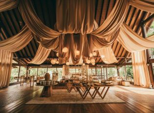 Após a cerimônia, os convidados são recepcionados em um salão de festas com estrutura profissional para até 300 pessoas, incluindo pista de dança, palco, cozinha industrial e deck externo integrado à paisagem. O complexo dispõe ainda de sala exclusiva da noiva e áreas de apoio para equipes técnicas e fornecedores. A hospedagem no próprio local é um dos grandes diferenciais. Suítes premium, cabanas privativas e áreas de descanso garantem conforto e privacidade para noivos, familiares e convidados, permitindo que a celebração se estenda por mais de um dia.