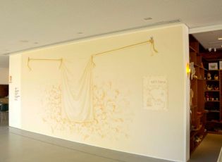 No centro do mural, há a pintura de um tecido pendido por cordas e pregos. O tecido, pintado com vinho canônico diluído em água benta, é um elemento recorrente na produção de Ramos. Ao redor desse tecido, o artista carimbou diferentes pés goianos. Para fazer as pegadas, utilizou como molde o seu próprio pé, além de pedir emprestados pés de diversos romeiros – alguns de sua própria família.