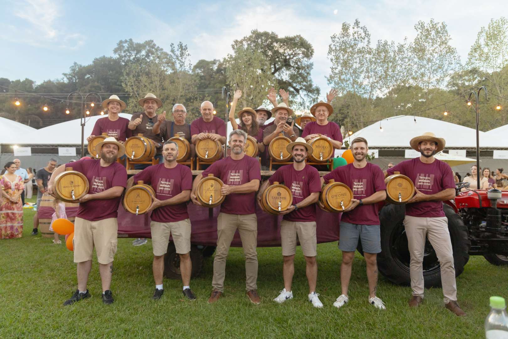 Mas houve um momento em que tudo silenciou — para emocionar. A entrada do trator, trazendo os produtores com suas barricas, foi mais do que simbólica. Foi a materialização de um ciclo inteiro de trabalho. De gerações. De histórias. Ali estavam Ademir e Moisés Brandelli (Vinhos Don Laurindo), André Larentis (Vinhos Larentis), Bruna Dachery (Monte Chiaro Vinhos Finos), Déborah e Aldemir Dadalt (Vinícola Ales Victória), João Valduga (Casa Valduga), Marcos Valduga (Vinícola Dom Cândido), Paulo Miolo (Vinícola Miolo), Plínio Pizzato (Pizzato Vinhas e Vinhos), Rogério Valduga (Vinícola Torcello), Ronaldo Zorzi (Vinícola Peculiare), Daniel Garbin (Chamom Garbin Vinhos Clássicos), Leonardo Giordani (Vinícola Casa Ottone) e Rudimar Festa (Vinícola Almaúnica), representando não apenas suas vinícolas, mas a história viva do Vale dos Vinhedos.