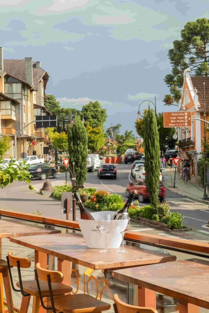 Um dos grandes destaques da casa, a varanda convida moradores e turistas a aproveitarem o clima da Serra Gaúcha para aquecer a conversa, brindar e curtir o happy hour ao ar livre. Sempre lembrando que o salão interno complementa a experiência com conforto e elegância. Ambos os espaços recebem o público diariamente, das 11h30 às 23h, reforçando a proposta de ser um destino versátil ao longo de todo o dia.